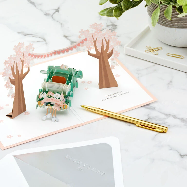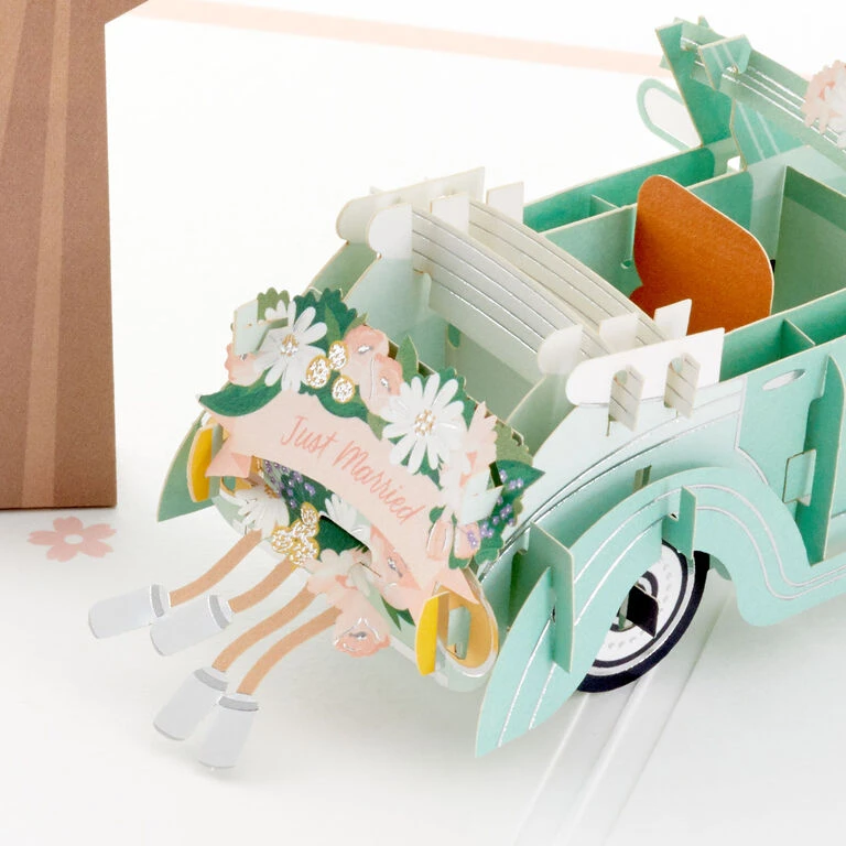 Pop-up wedding greeting card features flowers paired with a “Congratulations” message and silver foil accents and border on the front. Simply open the card to reveal the 3D pop-up surprise inside—no assembly required: an intricate, laser-cut scene featuring a decorated car with a “Just married” banner under flowering trees pops out. Silver foil accents add a shiny and shimmery touch to the inside of the card. This festive greeting crafted from premium card stock is a work of art sure to be displayed, making it an unforgettable way to share wedding congratulations with a happy couple. When open, card lays flat for display; 3D pop-up inside measures approx. 4″ H