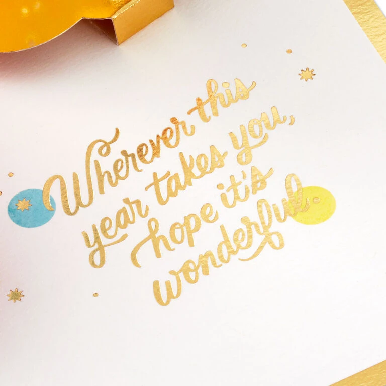 Pop-up birthday greeting card features colorful circles and stars paired with a celebratory message and gold foil border on the front. Simply open the card to reveal the 3D pop-up surprise inside—no assembly required: an intricate, laser-cut scene featuring a red truck and a colorful banner and decorations pops out. Gold foil accents add a shiny and shimmery touch to the inside of the card. This festive greeting crafted from premium card stock is a work of art sure to be displayed, making it an unforgettable way to share birthday wishes with someone special. When open, card lays flat for display; 3D pop-up inside measures approx. 4.25″ H.