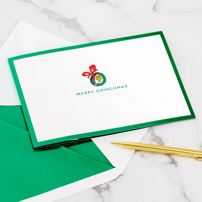 Pop-up Christmas greeting card features the Grinch from the Dr. Seuss classic “How the Grinch Stole Christmas!” peeking out of a wreath paired with a fun message and green foil border on the front. Simply open the card to reveal the 3D pop-up surprise inside—no assembly required: an intricate, laser-cut scene featuring characters from this beloved holiday story pops out. Green foil accents add a festive touch to the inside of the card. This festive greeting crafted from premium card stock is a work of art sure to be displayed all season long, making it an unforgettable way to share Christmas and New Year wishes with kids, friends or family members. When open, card lays flat for display; 3D pop-up inside measures approx. 5.75″ H.
