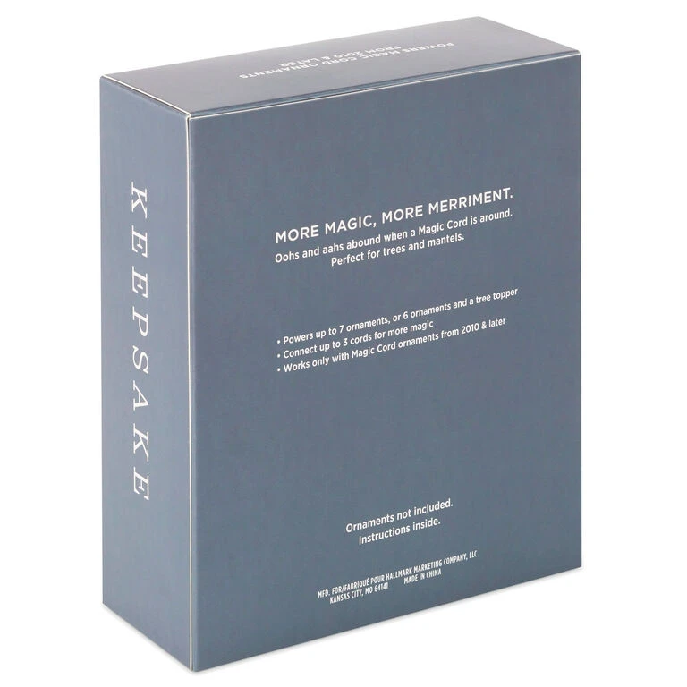 Bring the magic to life for your Hallmark Keepsake Magic Cord Ornaments with this Hallmark Keepsake Magic Cord. Power up to 7 compatible Hallmark Keepsake Ornaments, or 6 ornaments and a tree topper (released from 2010-2020). Connect up to three Magic Cords for bigger displays. Includes wall outlet power adapter and instructions. Ornaments sold separately.